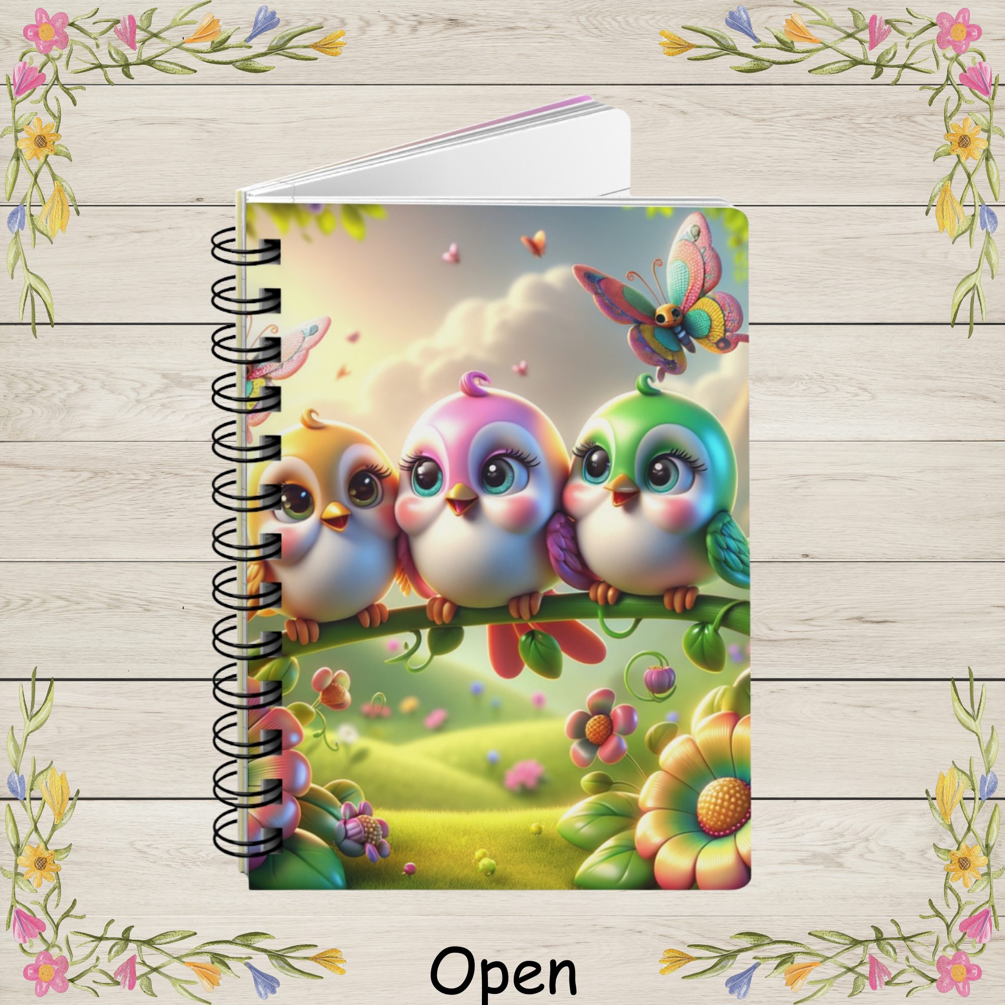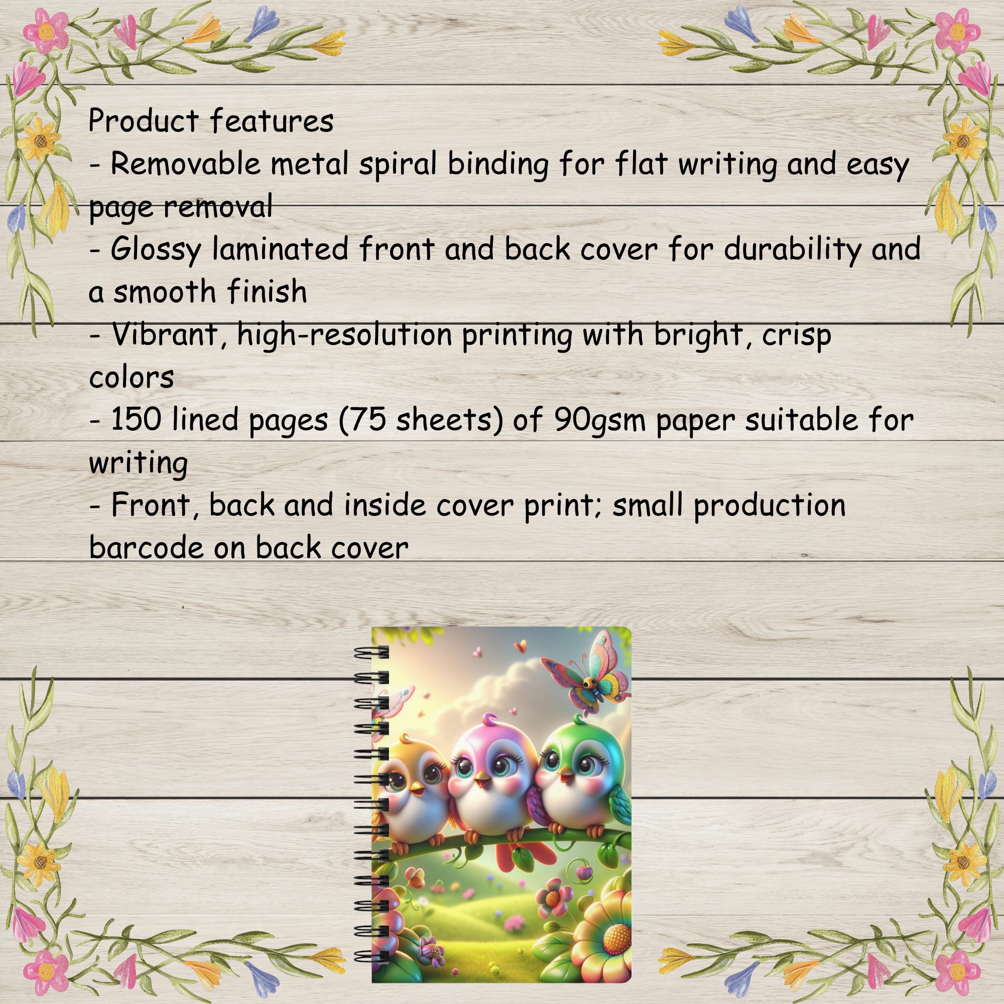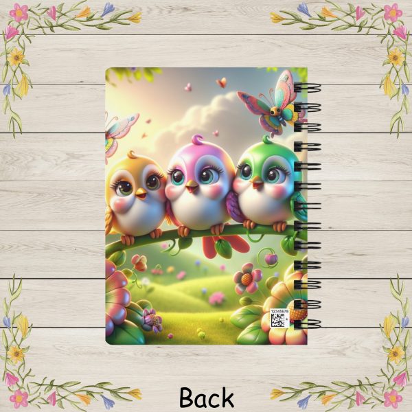 | Bring a touch of springtime magic to your daily writing with this Whimsical Trio of Springtime Songbirds Spiral Journal. The glossy pastel cover features three adorable, wide-eyed birds perched together on a flower-lined branch, each in soft shades of yellow, pink, and green. Fluttering butterflies dance around them while rolling green hills, warm sunlight, and floating blossoms create a dreamy, fairytale-like backdrop. Perfect for bird lovers, kawaii art fans, and anyone who appreciates uplifting stationery, this journal adds charm and joy to planning, studying, or creative writing. The durable, high-resolution printing wraps around the entire cover for a seamless, vibrant finish that stays bright with everyday use. Inside, you’ll find 150 lined 90gsm pages—smooth, dependable paper ideal for journaling, lists, classroom notes, or daily reflections. The sturdy metal spiral binding lets the notebook lie flat for comfortable writing and allows pages to be removed cleanly when needed. Whether used as a personal notebook or gifted for birthdays, Easter, Mother’s Day, or spring celebrations, this pastel songbird journal is sure to brighten anyone’s day. Product Features: Care Instructions: | ||||||