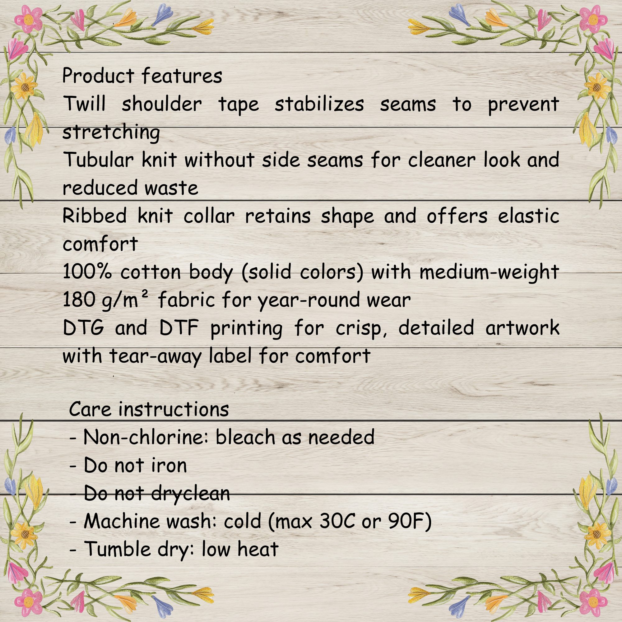 Printed using high-quality DTG and DTF methods, the artwork stays crisp and detailed while keeping a soft feel. The tubular knit construction gives it a clean look with no side seams, and reinforced shoulders help it hold its shape wash after wash.