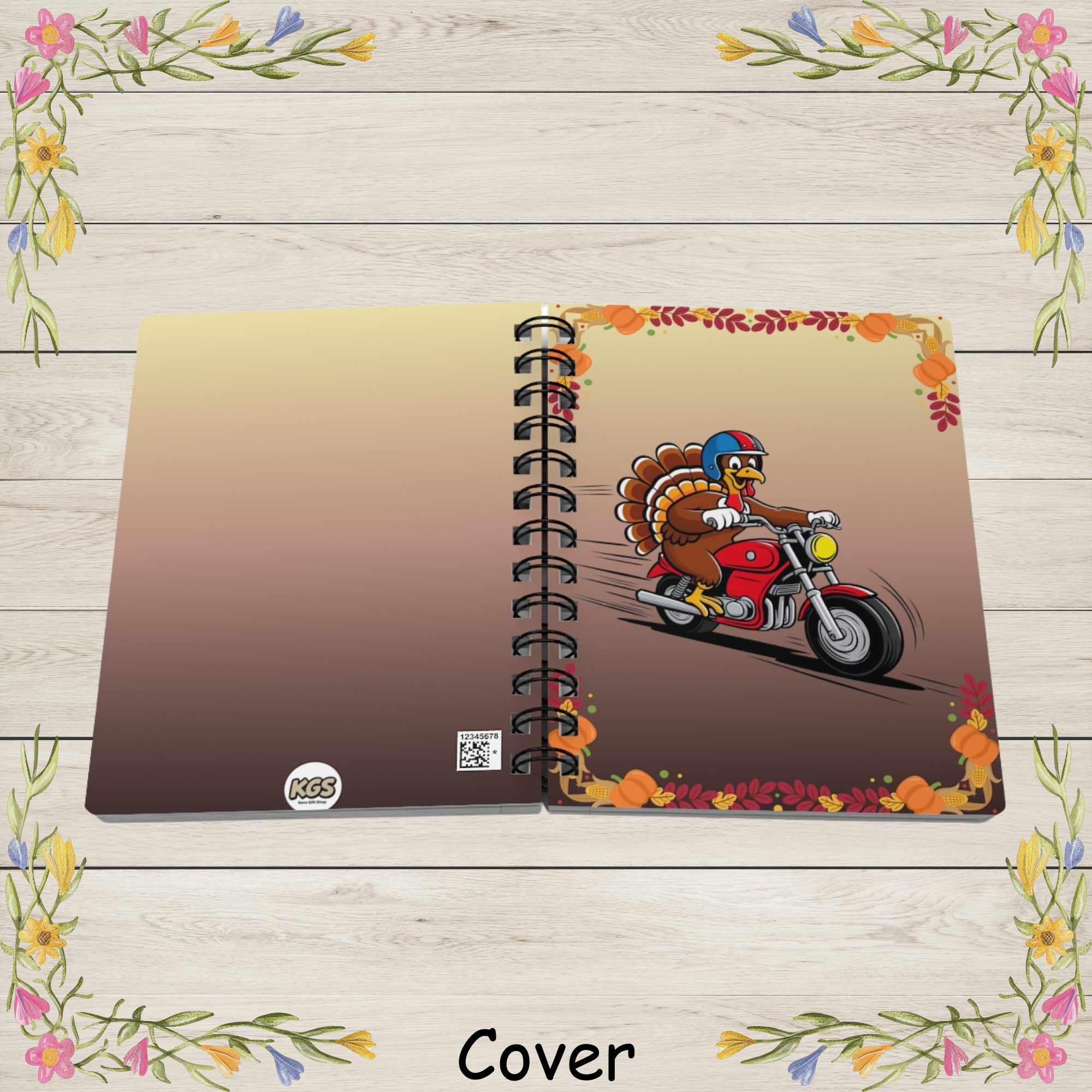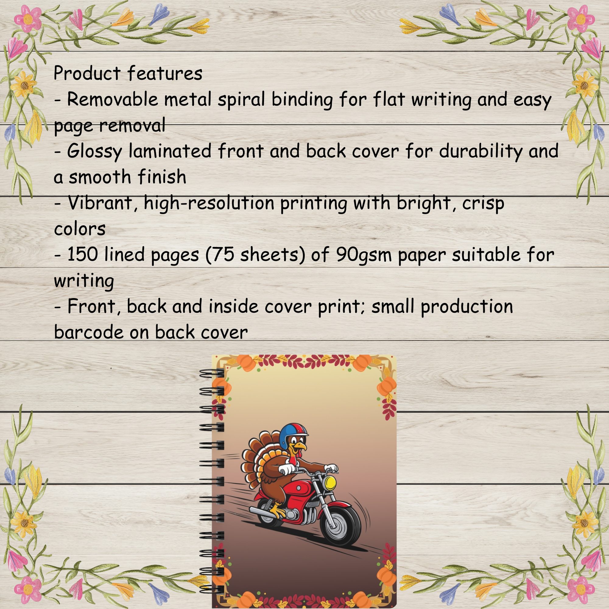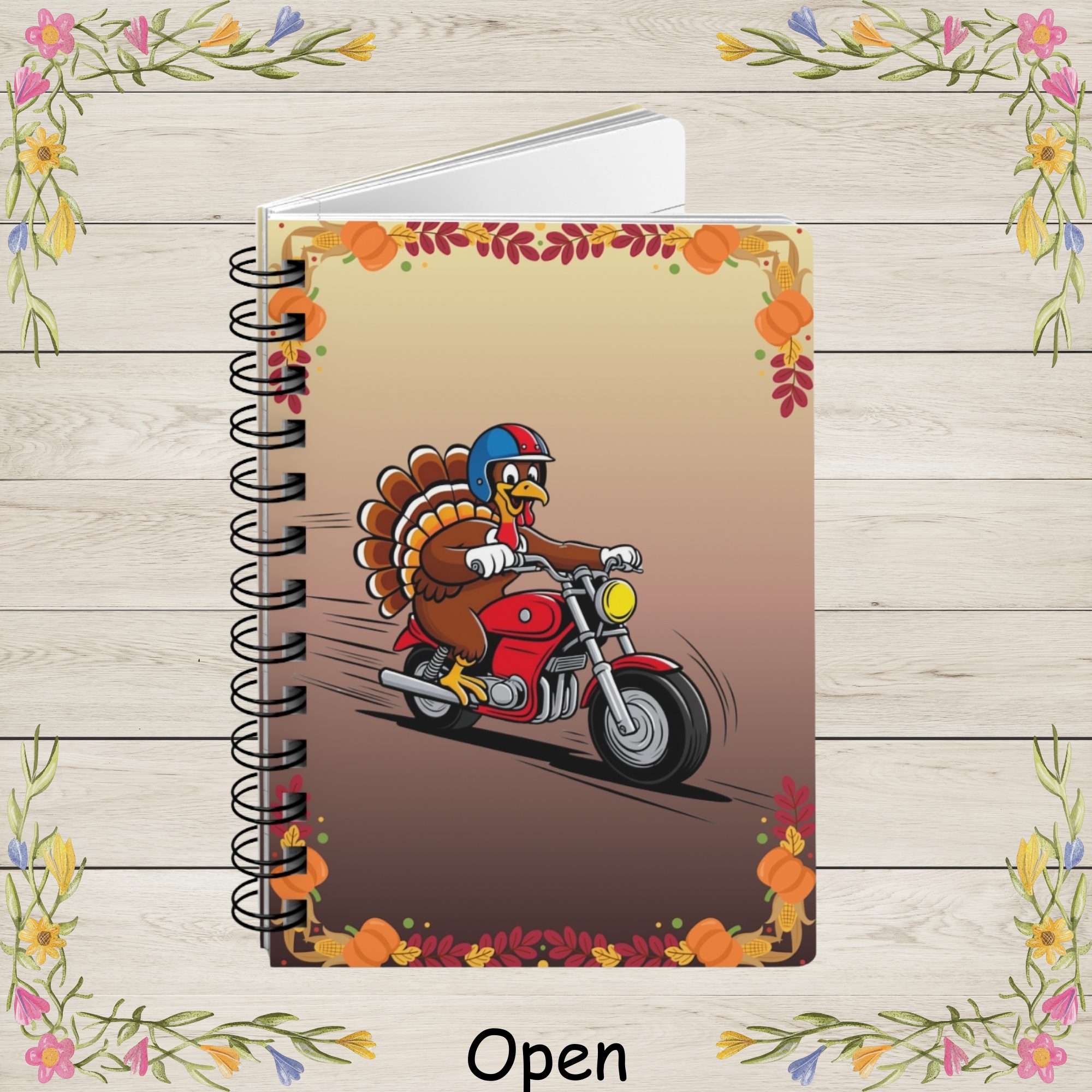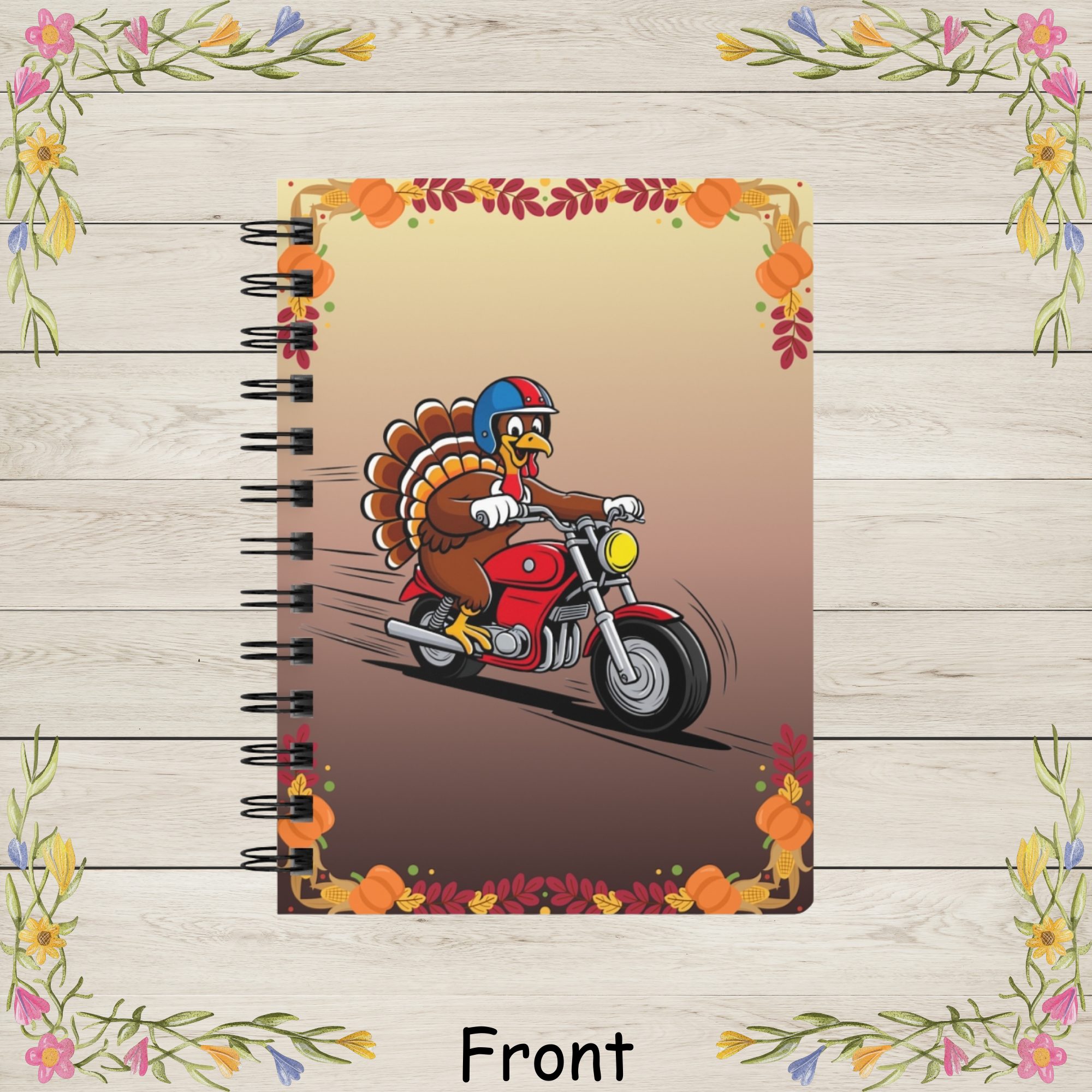 | Bring fun, festive personality to your daily writing with this Thanksgiving Turkey Motorcycle Rider Spiral Journal! Featuring a cheerful cartoon turkey zooming down the road on a bright red motorcycle, this playful design adds a humorous twist to classic holiday charm. With a big smile, colorful helmet, and full-speed energy, the turkey is surrounded by a warm border of pumpkins, corn, acorns, and fall leaves — the perfect seasonal touch for autumn lovers. The glossy laminated cover showcases bright, crisp, high-resolution artwork that won’t fade, making this journal both durable and eye-catching. Inside, you’ll find 150 lined pages of smooth 90gsm paper, great for note-taking, doodling, gratitude journaling, recipe jotting, project planning, or keeping holiday memories. The metal spiral binding allows the notebook to lay completely flat and lets you remove pages cleanly when needed. Compact and easy to carry, this fun holiday notebook fits easily into backpacks, purses, or tote bags. Whether you’re shopping for a unique Thanksgiving gift, treating yourself to a festive seasonal journal, or looking for a cheerful addition to your desk, this colorful notebook is sure to brighten every writing moment. Product Features: