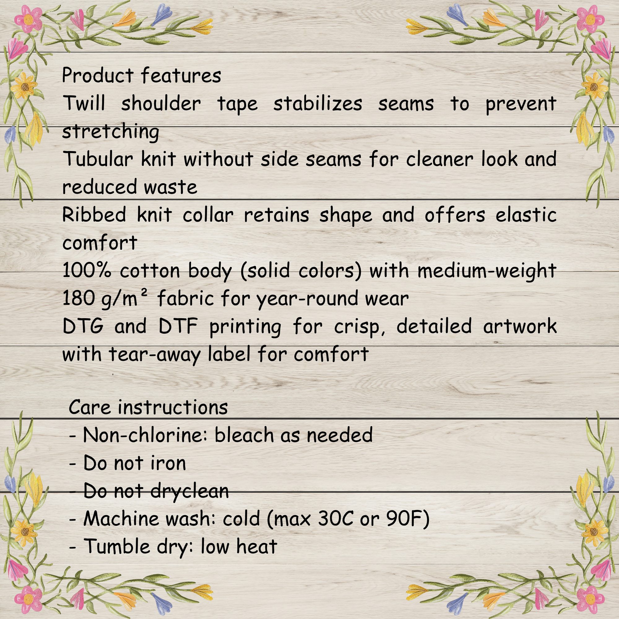 – 100% cotton (solid colors) — medium 180 g/m² fabric for year-round comfort